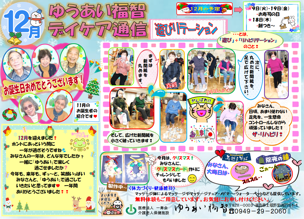 令和7年 皆様への感謝 本年も大変お世話になりました。 利用者・入居者・ご家族、そして関係者の皆様大変お世話になりました。 来年も職員一同、利用者・入居者様と関わる中で成長し、笑いの中で安心と安全のケアが提供できるよう精進して参ります。 職員一同